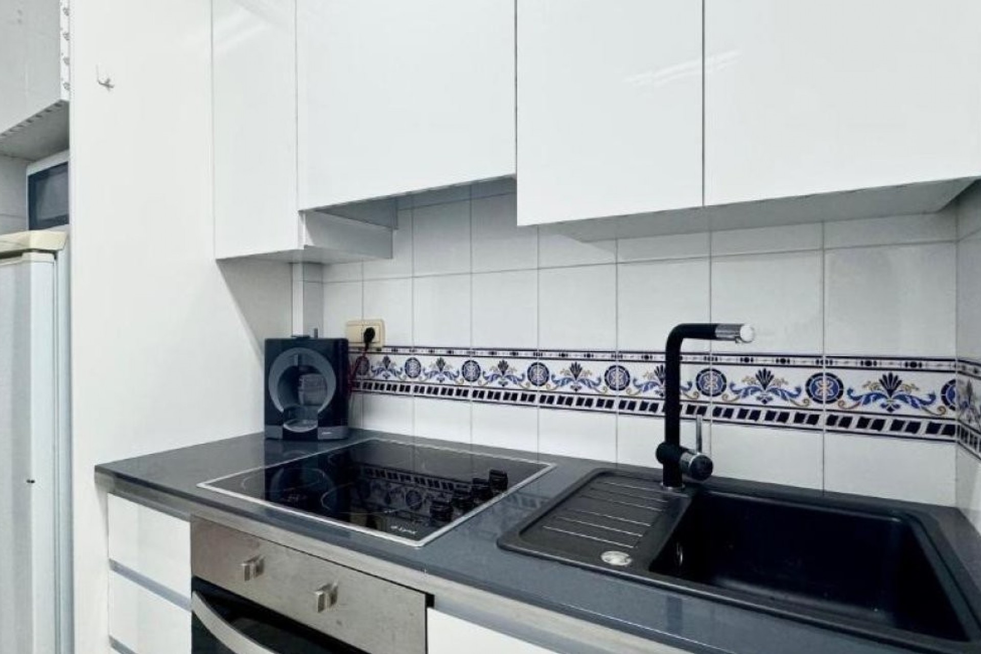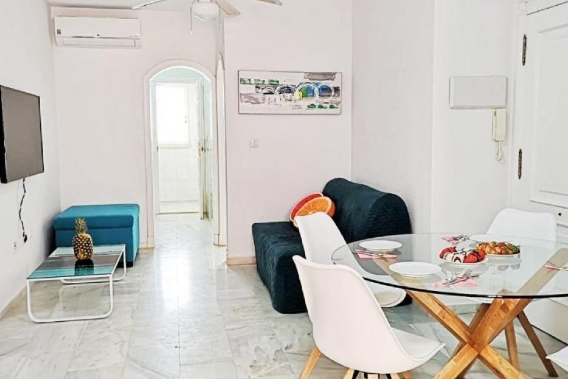 Apartment for sale in Duquesa Beach, ground floor, no elevator. Sea views. 1 bedroom, 1 bathroom, separate equipped kitchen (dishwasher, refrigerator, ceramic hob, washing machine, oven). Air conditioning in the living room and bedroom. It has a storage room, swimming pool, and tourist license.