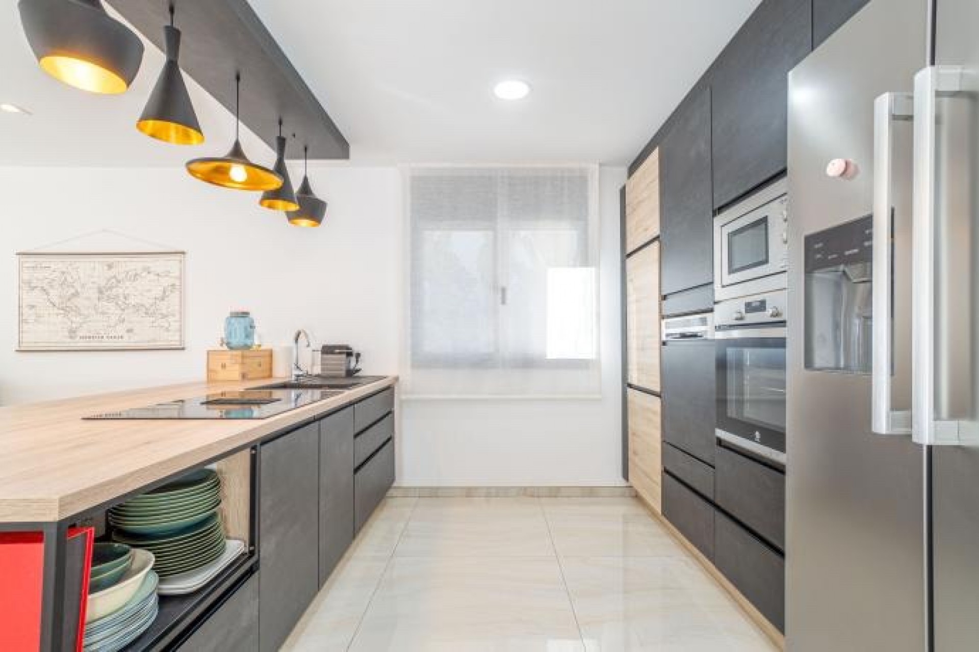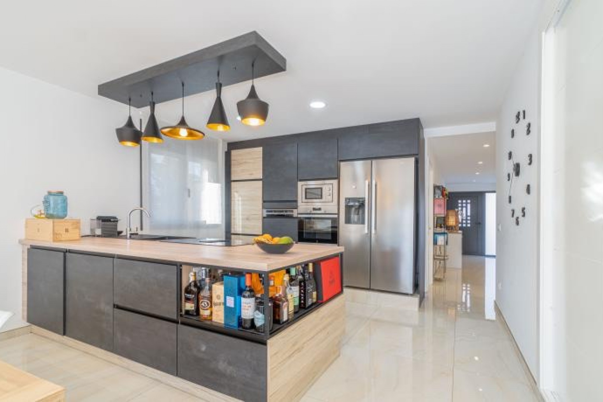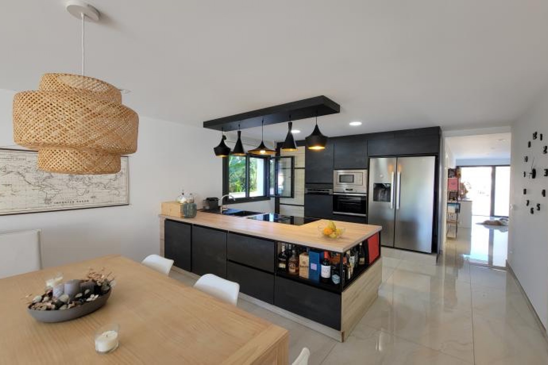 La cocina, completamente equipada, se caracteriza por su luminosidad y unas vistas excepcionales a la piscina, lo que la convierte en un espacio ideal para disfrutar de momentos agradables.