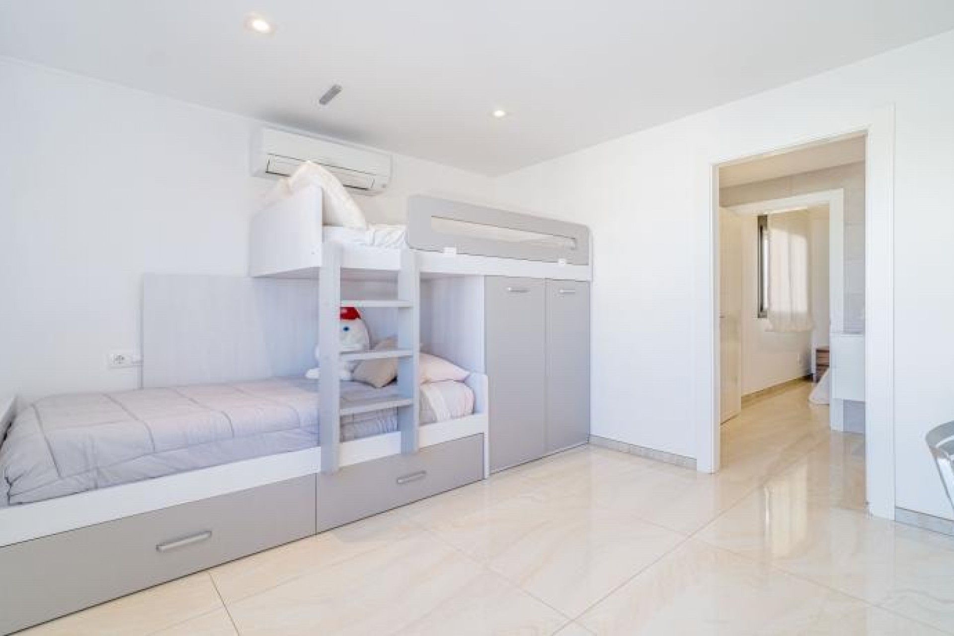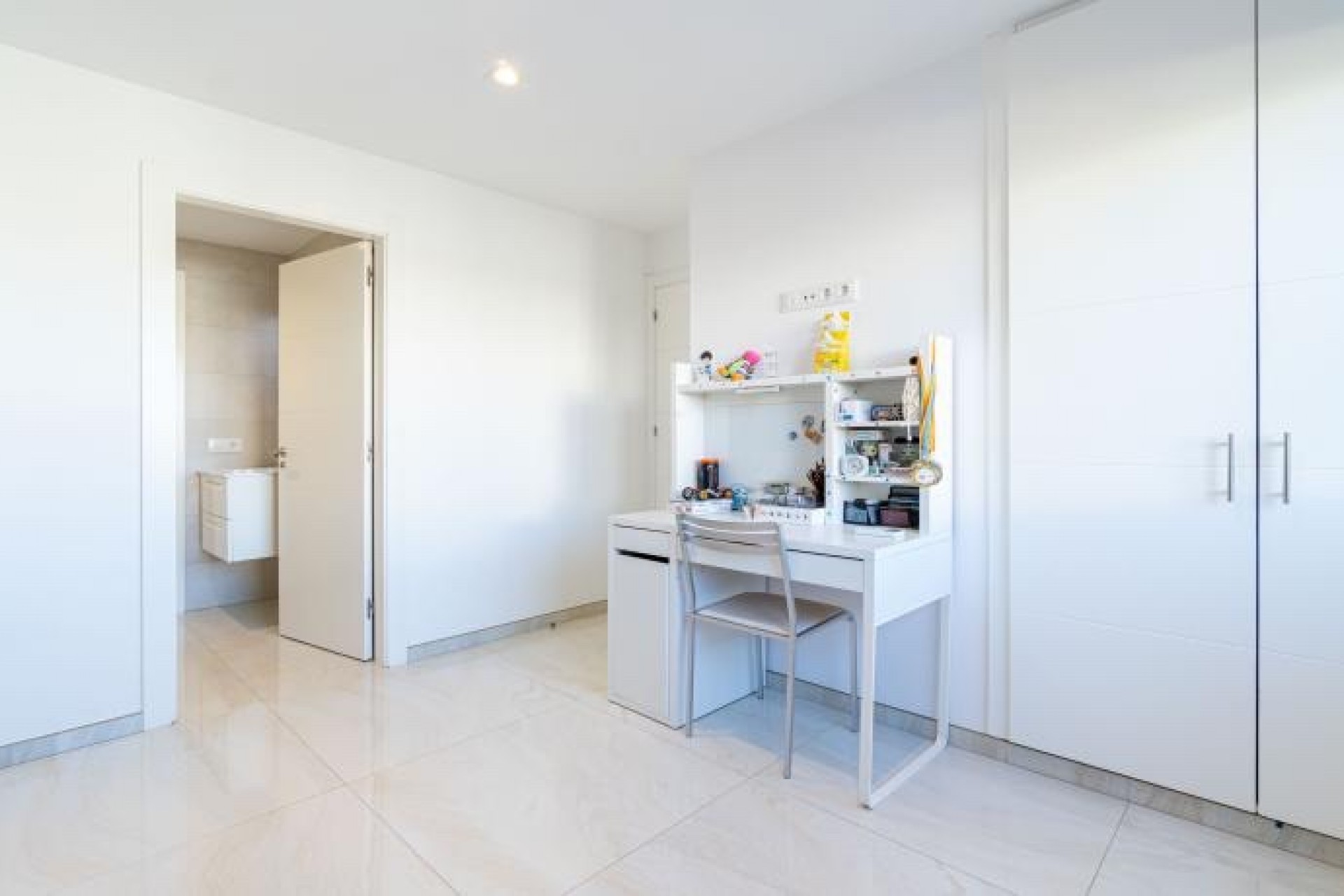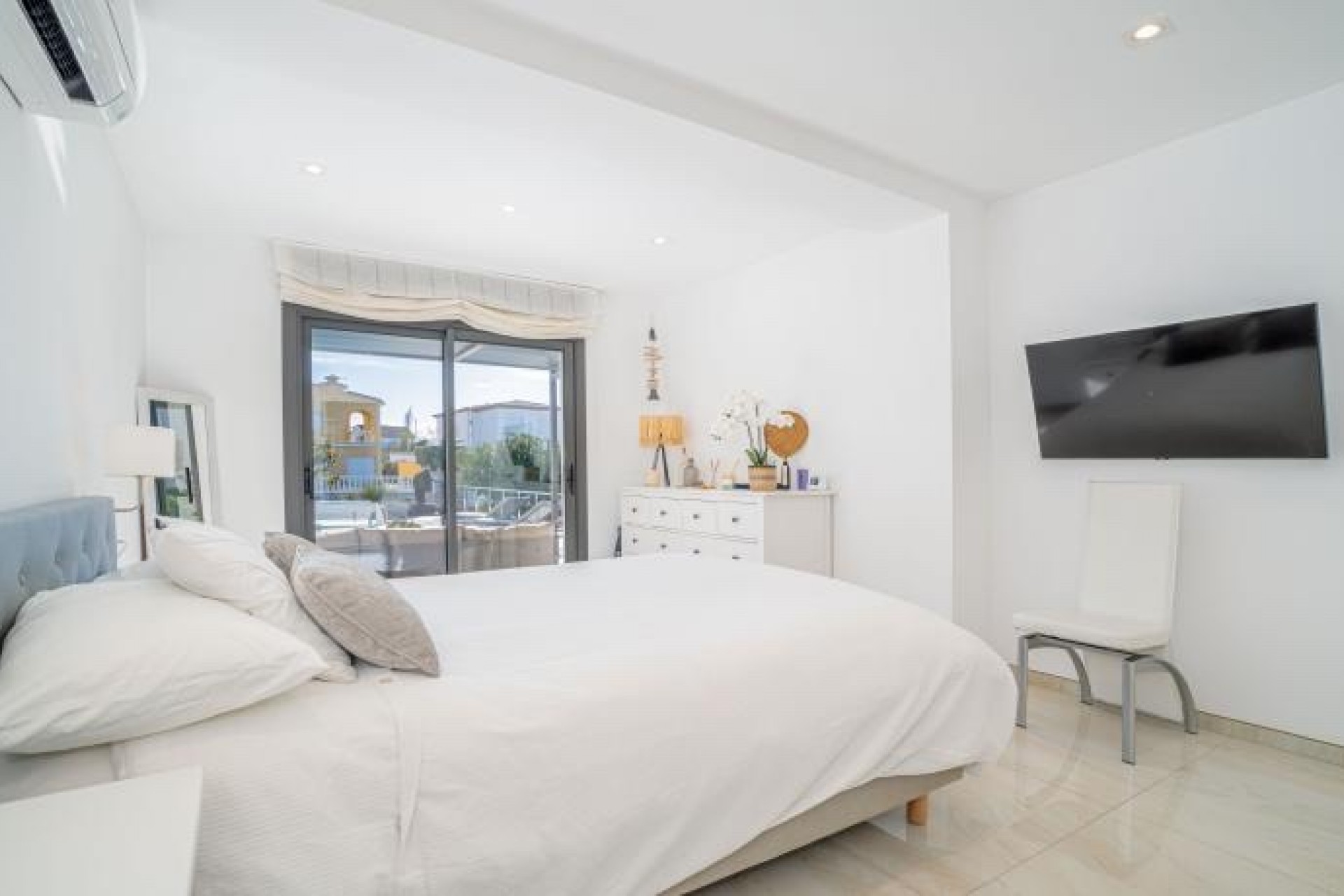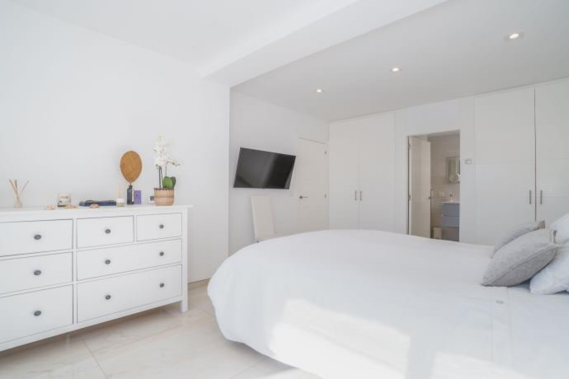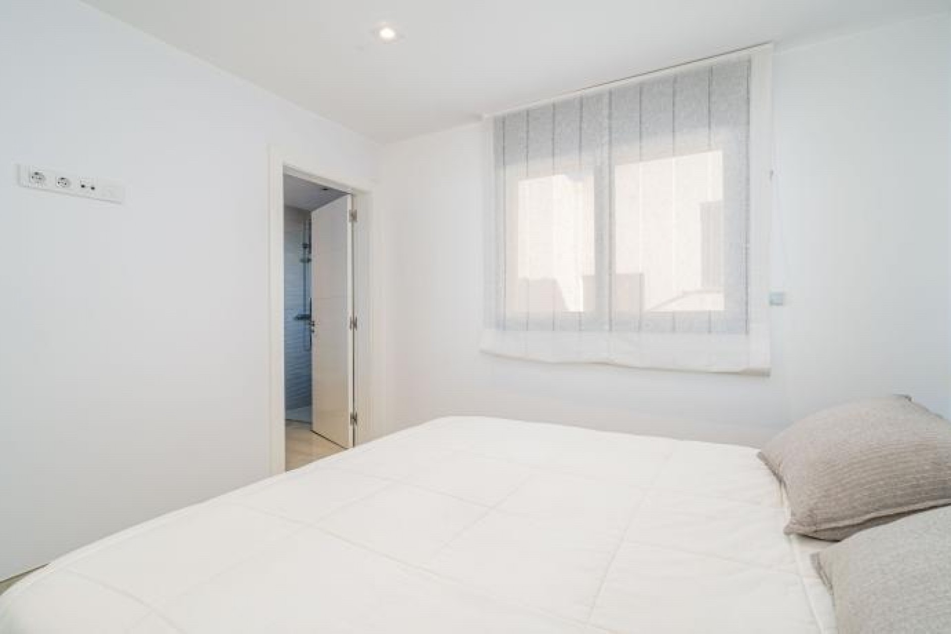 La propiedad se distribuye en una sola planta, con dos amplios dormitorios, cada uno con armarios empotrados, y un baño con ducha que conecta ambos. Además, cuenta con una suite privada con acceso a la terraza y a la piscina climatizada, perfecta para relajarte en cualquier época del año. Para mayor comodidad, también dispone de un WC para invitados.