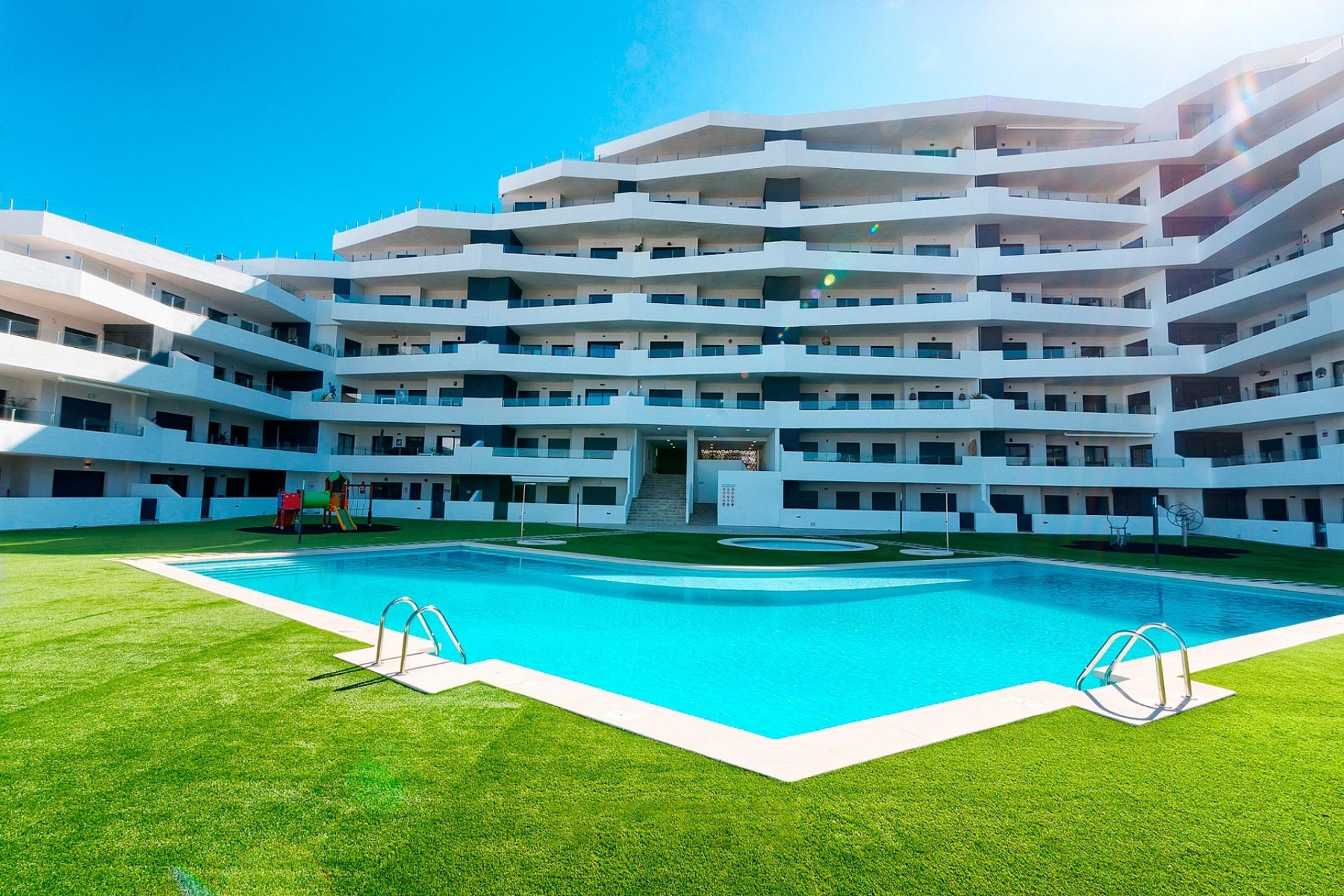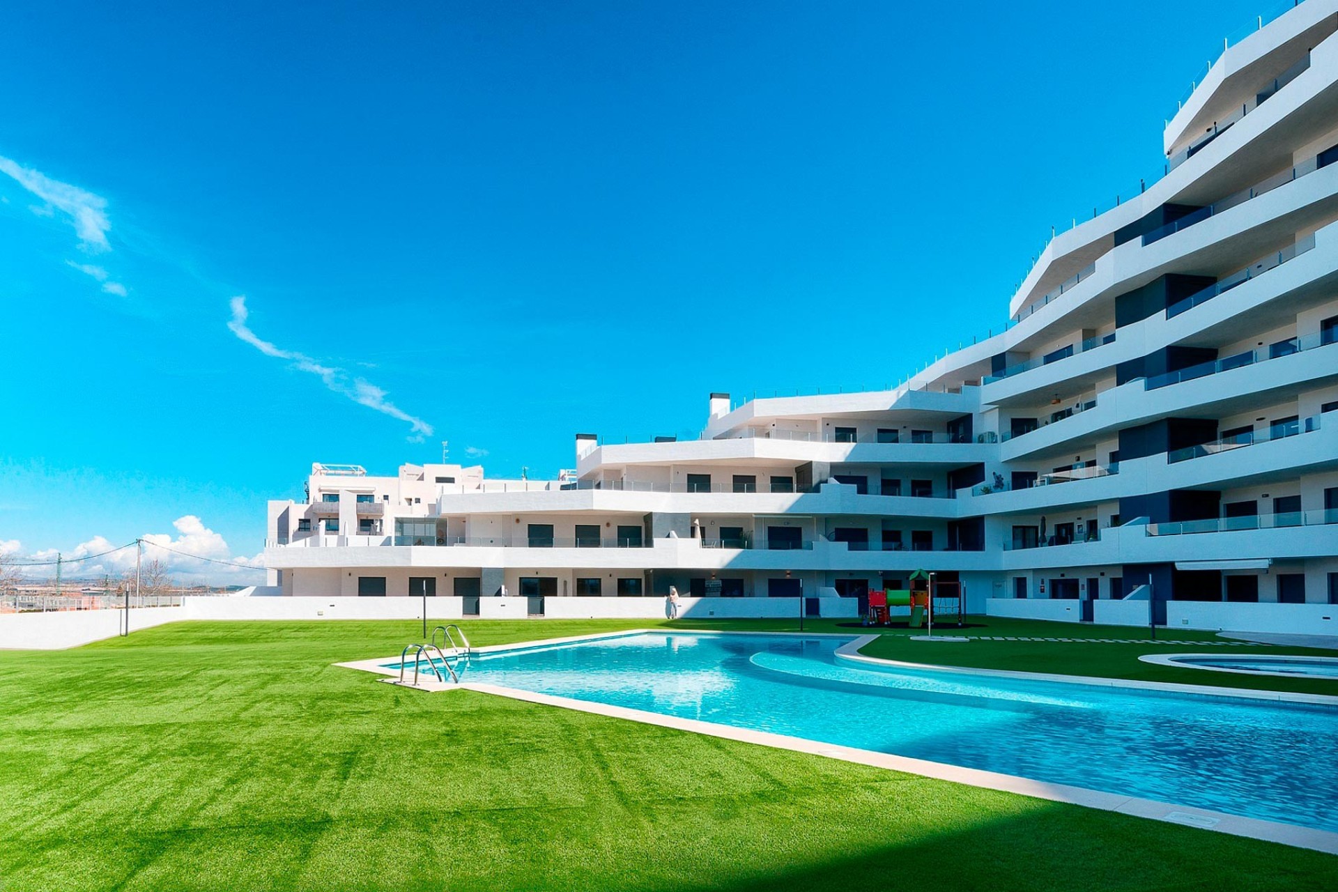 Estamos encantados de presentarles “Cruise Resort”, una nueva promoción de apartamentos de última generación en la hermosa ciudad española de San Miguel de Salinas, cerca de Campos de Golf, playa y Centros Comerciales. El residencial es completamente cerrado y está formado por apartamentos de 2 y 3 dormitorios, y 2 baños, con un estilo escalonado, para dotar a cada una de las viviendas de amplias terrazas. Otro punto a destacar de Cruise Resort son sus zonas comunes centrales, compuestas por piscinas comunitarias para adultos y niños, zonas verdes, área de juegos para niños y zona para adultos con circuito bio-saludable. Todos los apartamentos incluyen plaza de aparcamiento, pero el trastero privado en el sótano está disponible por un coste adicional. San Miguel es un destino ideal para quienes buscan la tranquilidad de los pueblos, sin renunciar a los servicios. Se encuentra a menos de 10km de las playas de Orihuela, Torrevieja y Guardamar. Además, la localidad cuenta con todas las comodidades que puedas necesitar: colegios, farmacias, bancos, parques, así como una amplia oferta de restauración. ¿Quieres conocer más detalles de esta promoción? ¡Contacta con Sunnier Homes!
