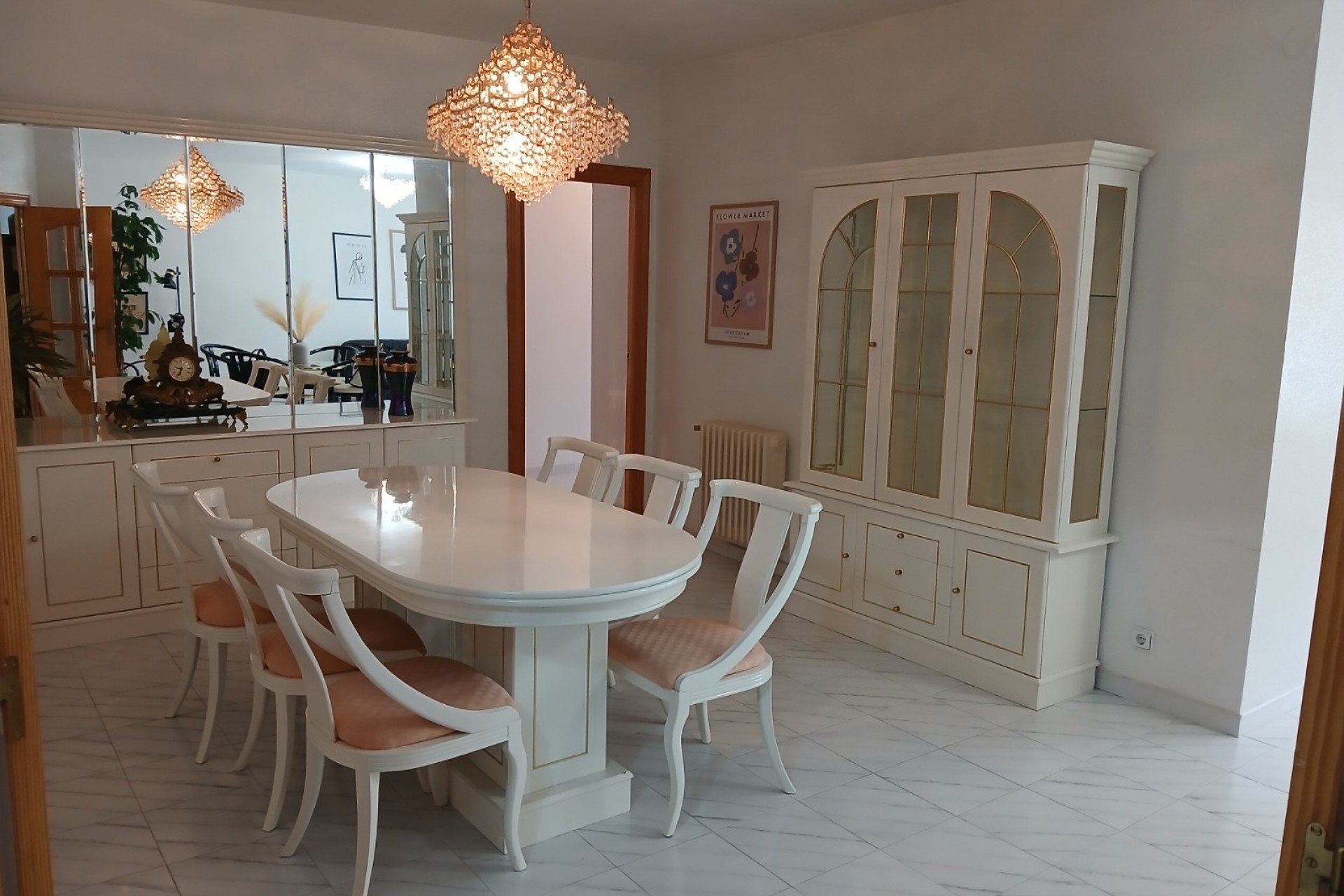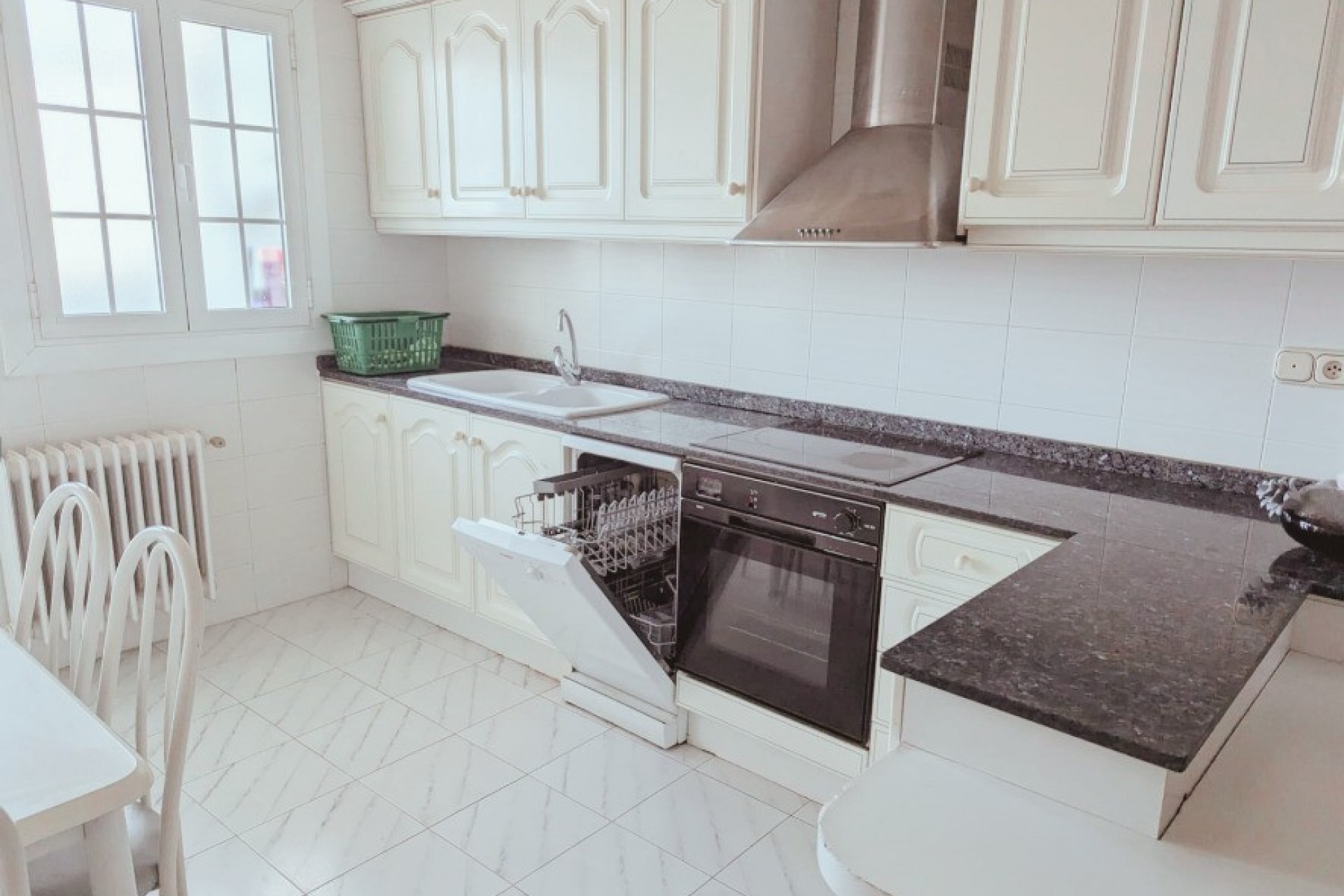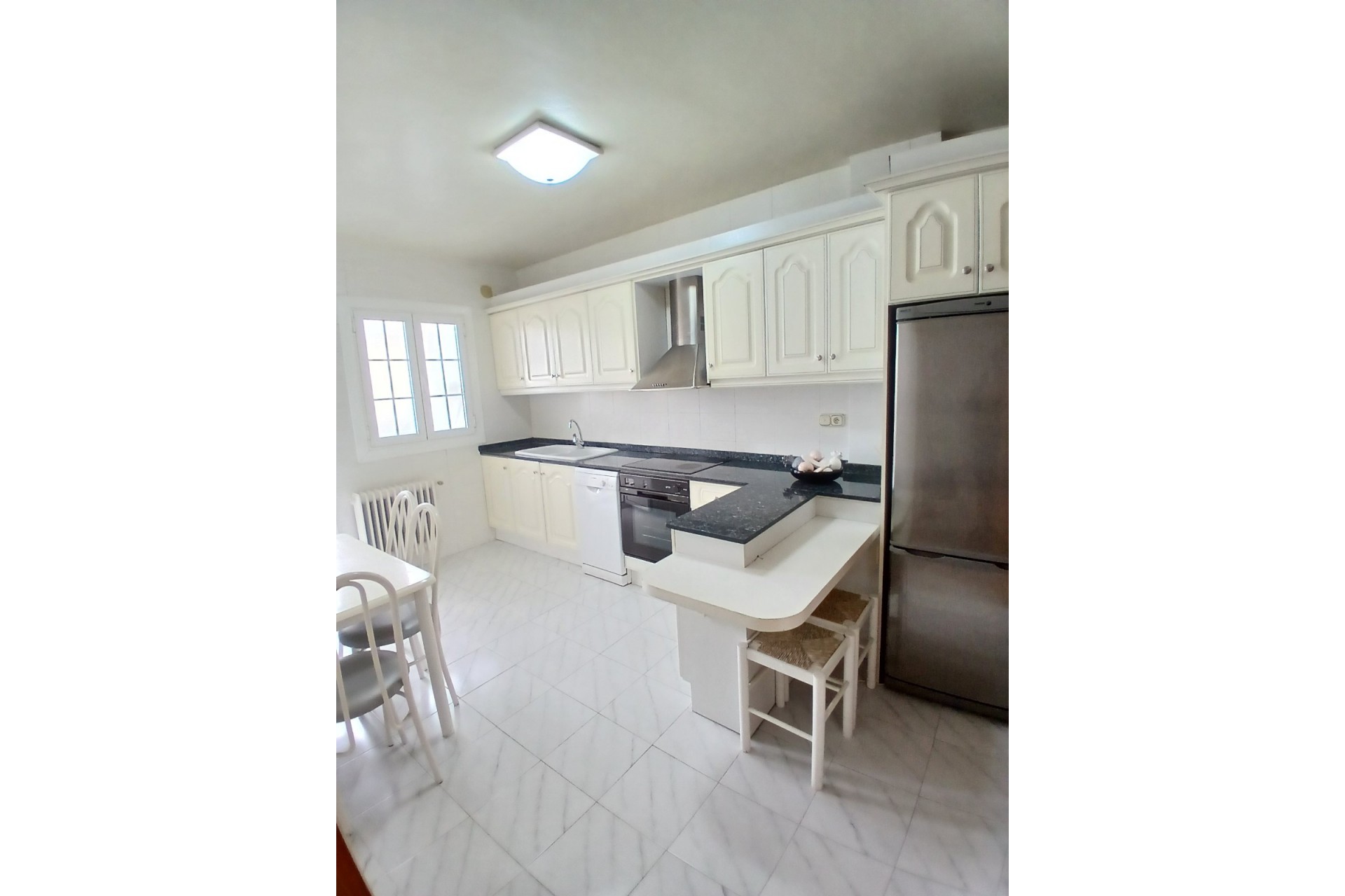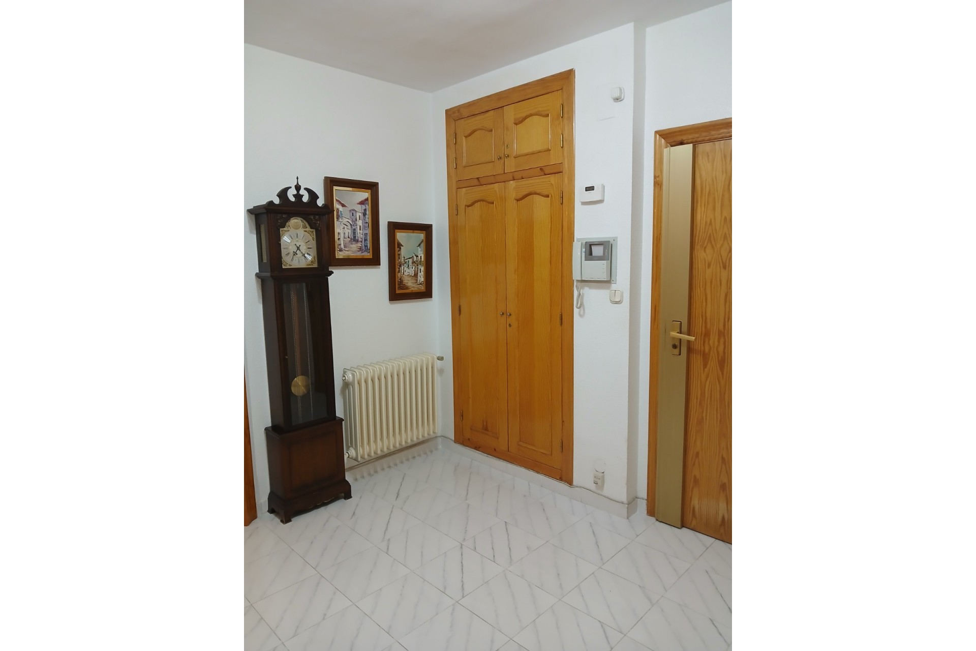 Spacieux penthouse lumineux en plein centre de Yecla, avec toutes les commodités, y compris son propre hôpital. Le penthouse dispose d'une entrée spacieuse avec placards et d'un très grand salon-salle à manger de 42,2m2 avec beaucoup de lumière naturelle. Il y a une cuisine séparée de 11,3m2 avec un four encastré, une plaque électrique avec hotte, un petit lave-vaisselle Bosch et un réfrigérateur-congélateur. Pour un rangement supplémentaire, il y a une buanderie de 2,7m2. Adjacente à la cuisine se trouve une buanderie avec chaudière et évier, cette pièce s'ouvre sur un balcon à l'ombre pendant la journée, vous n'aurez donc pas à souffrir de la chaleur. Il y a 4 chambres à coucher, la plus grande de 13,26m2 a une baie vitrée et une grande armoire faite sur mesure, la chambre de taille moyenne de 11,3m2 a également une armoire faite sur mesure. En outre, il y a 2 autres chambres de 8,9m2 dont l'une est actuellement utilisée comme coin lecture, cette chambre a également un balcon privé de 10,9m2, où vous pouvez profiter du soleil et travailler votre bronzage ;-). Enfin, il y a 2 salles de bains, 1 de 4,6m2 avec baignoire et 1 de 5,3m2 avec douche. La maison est entièrement équipée de double vitrage et de volets. En outre, il y a un chauffage central (séparé par appartement) au mazout, l'installation se trouve dans une pièce séparée une l'étage supérieur. Il y a un grand garage sous l'appartement, les résidents peuvent y louer une place de parking moyennant une redevance (40-50 euros par mois). Les propriétaires actuels ne l'ont pas utilisé car ils n'avaient pas besoin de voiture en ville. La propriété est disponible immédiatement.