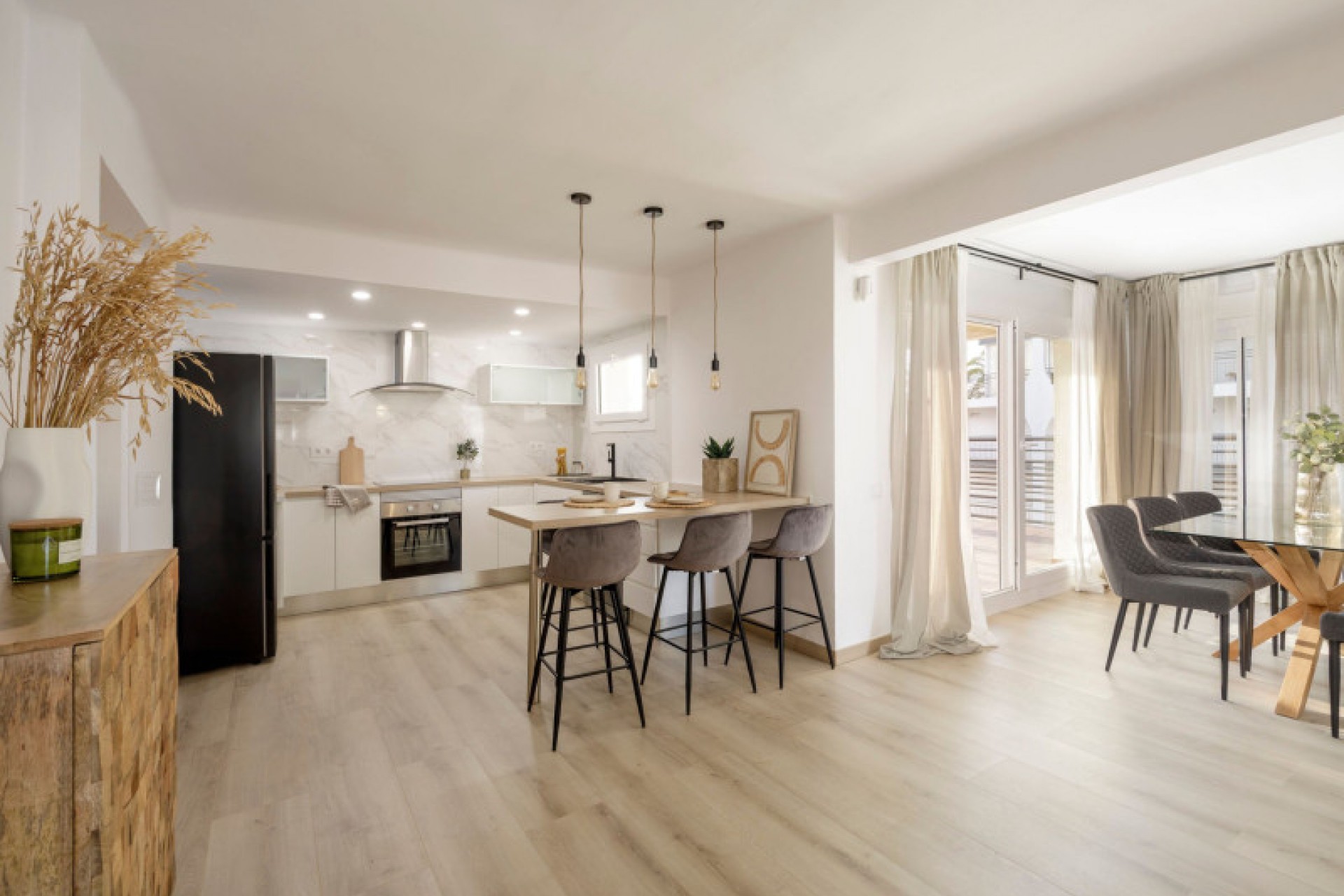 La cuisine, intégrée dans le vaste salon, est équipée d'appareils électroménagers haut de gamme et offre une esthétique fonctionnelle qui stimulera votre créativité culinaire. Le salon/salle à manger généreusement aménagé crée une atmosphère chaleureuse et lumineuse, idéale pour partager des moments inoubliables en famille et entre amis.