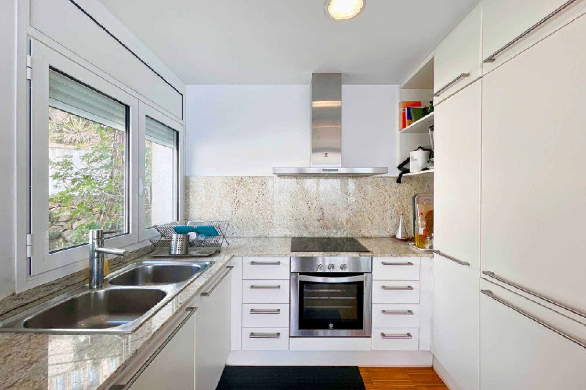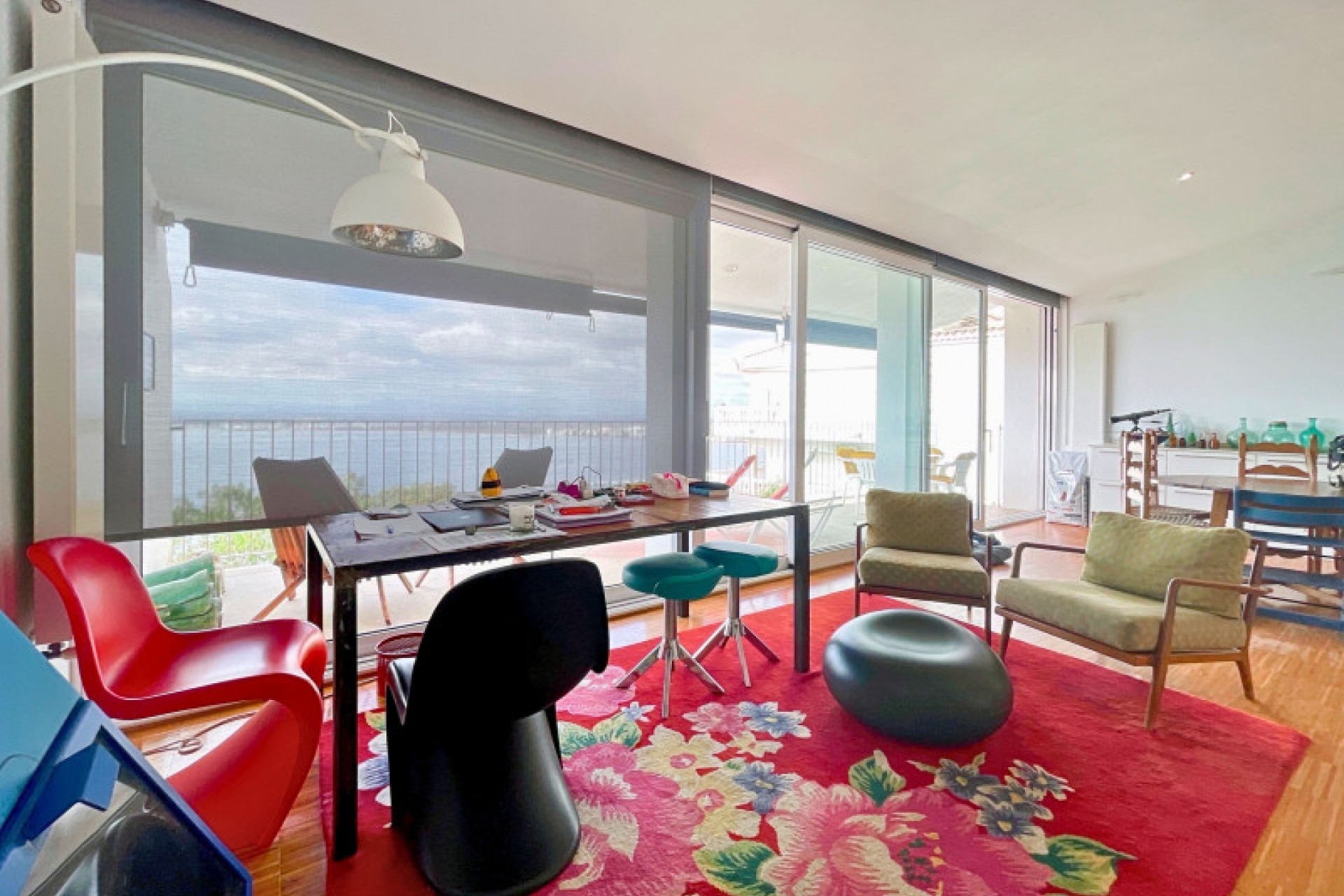 Au premier étage, le spacieux salon-salle à manger avec cheminée se marie harmonieusement avec la cuisine et donne accès à une terrasse extérieure avec vue panoramique sur la mer.